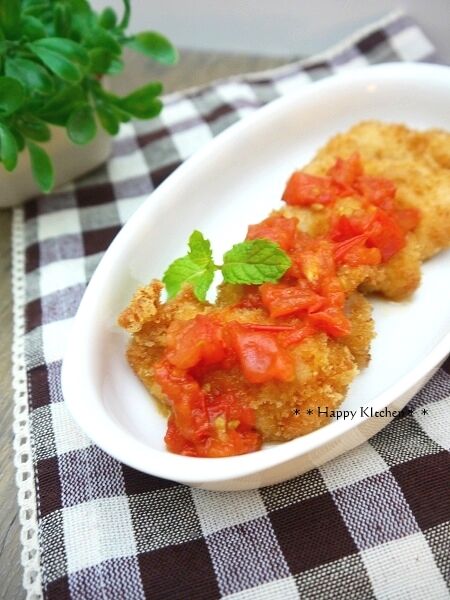 簡単チキンカツ*オススメトマトソースがけ これ、とっても好評でした。最初は、トマト苦手な子供達がこれを見て「えー、せっかくのカツに何てことを・・・」って感じの反応でしたが、「ソース美味しい!」と喜んで食べてくれました。カツも衣が面倒だったんでマヨネーズで。鶏むね肉を包丁の背で少し叩いて繊維を断ち ... 2013/08/11 続きを読む
