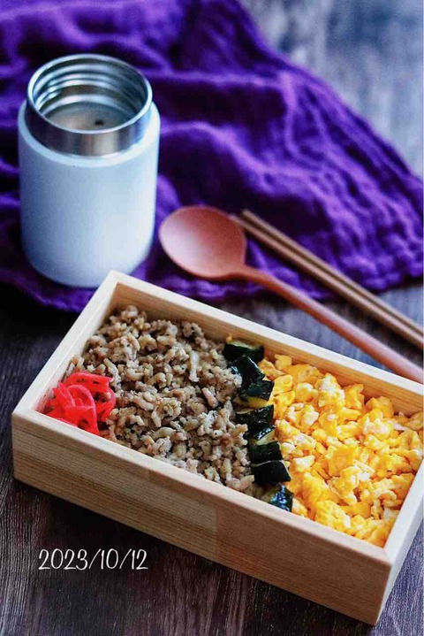 10/18〆切です(新刊ご購入キャンペーン)と、今日の高校生男子弁当【三色そぼろ丼弁当】 久々の高校生男子弁当、週始めに作った作りおきがほんのちょっと残っていたので、今日のお弁当で使い切りました。塩そぼろと炒り卵の間に置かれているのは海苔か?って感じですが、ズッキーニのにんにく醤油を小さく切ったものを並べています。黒にしか見えないけど、まさか ... 2023/10/12 続きを読む