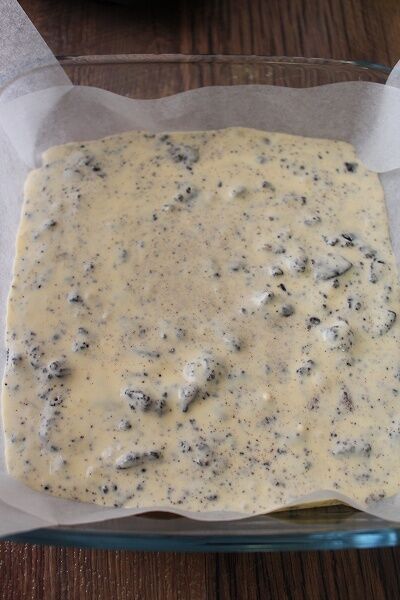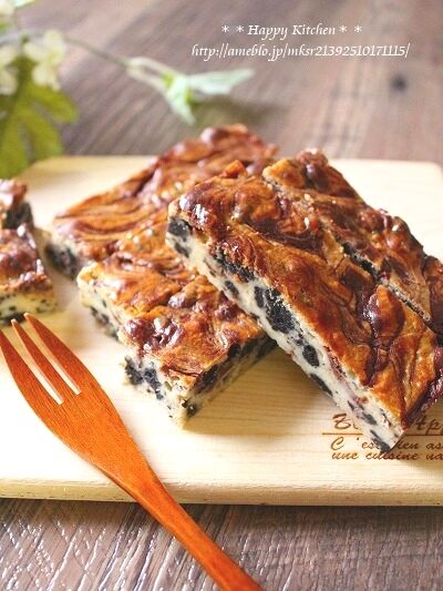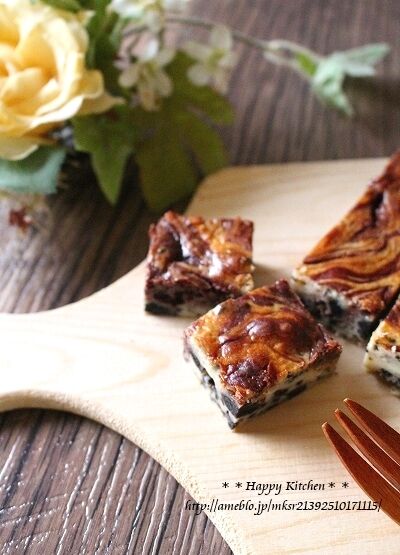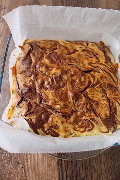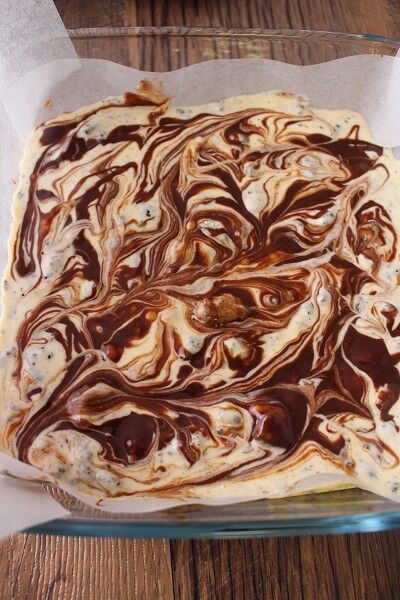 ③砕いたオレオを①の生地に入れてざっくり混ぜ、クッキングシートを敷いた型に流す。そこに②のチョコレートを線を描きながら流し、お箸などでクルクル回してマーブル模様にする。