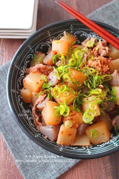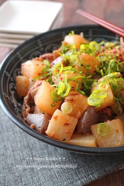 ①大根は3cm角くらいに切り、こんにゃくはスプーンでちぎり、鍋に大根と共に入れて大根が透き通るまで茹でる。