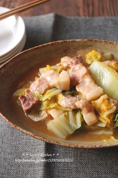 ②厚手の鍋に玉ねぎを入れ、その上に豚肉、覆うようにして最後に白菜を乗せ、★をまわしかけて蓋をして中火で15分煮る。(途中1度全体を混ぜる)