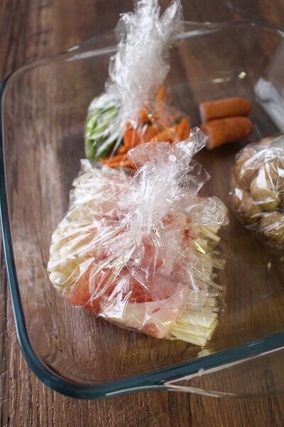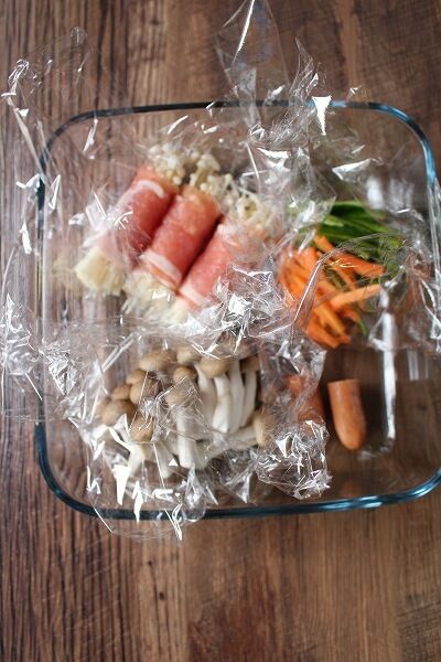 ピーマンと人参は細切りにし、ラップに乗せてからめんつゆをまわしかける。