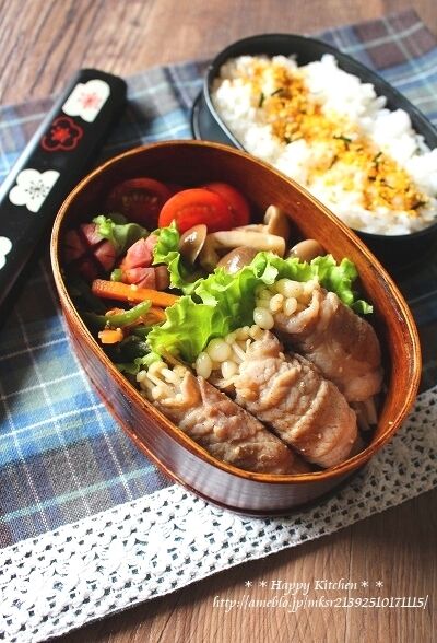 えのきは根元を切り落とし、豚肉で巻いて塩こしょうを振る。