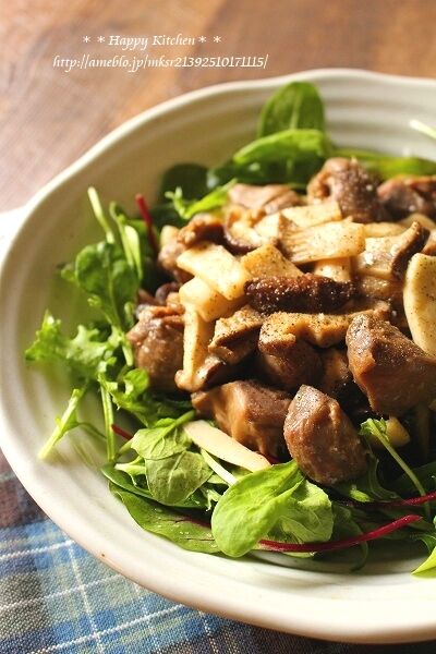 ①砂肝は筋を切り、エリンギと椎茸は適当な大きさと幅に切る。オリーブオイルを熱したフライパンで砂肝をしっかり焼く。