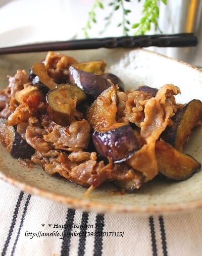 ②ごま油を熱したフライパンで豚肉を炒め、こんがりしたら茄子を加えて炒めてしんなりしたら★を加えてフライパンを揺すって手早く炒める。