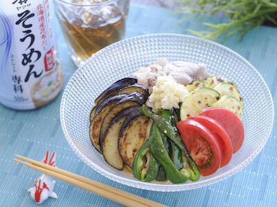 「焼き夏野菜とおろししょうがの冷しゃぶそうめん」