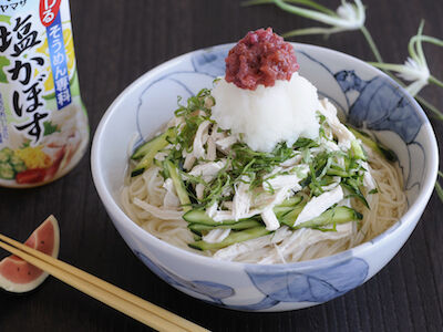「蒸し鶏の梅塩かぼすおろしそうめん」