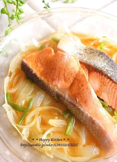 ②耐熱皿に玉ねぎとピーマンを敷き詰め、その上に鮭を乗せて★の酒をまわしかけて胡椒を振り、バターをちぎって数か所に置く。