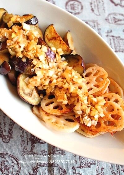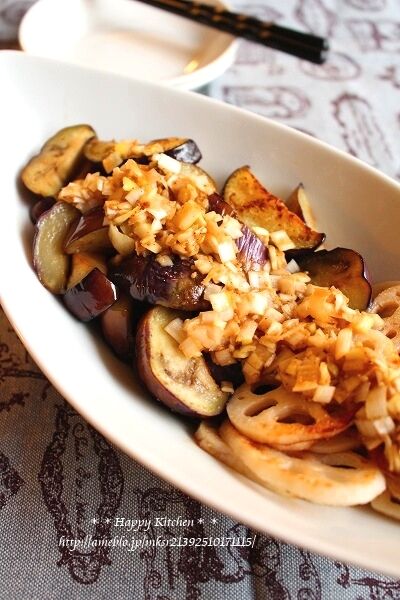 ③同じフライパンに茄子を入れ、しんなりするまでよく炒めて蓮根と共に器に盛り、よく混ぜた★を上からかける。