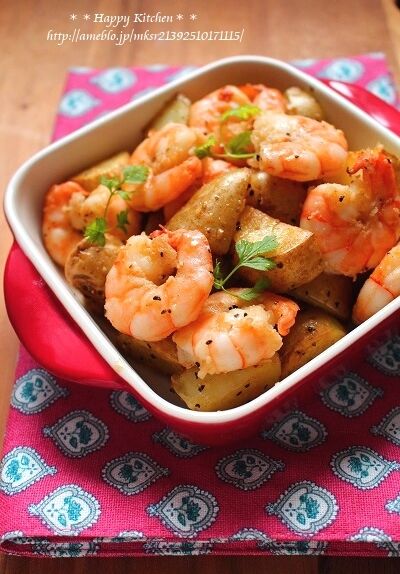 「海老とじゃがいもの塩ガーリックオイル炒め」