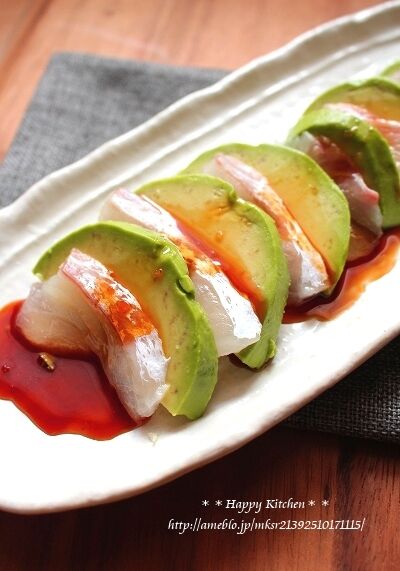 ①アボカドは横半分に切って種をくり抜き、皮を剥いて5㎜幅に切る。鯛は薄く切る。お皿に交互に並べる。