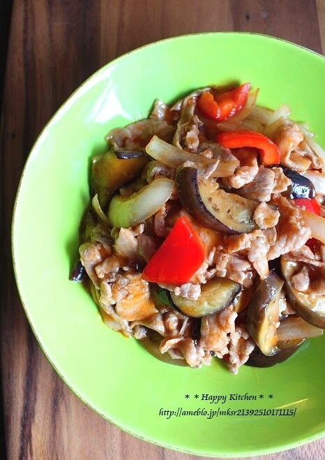 ③豚肉の色が変わったらパプリカと②の茄子と玉ねぎを入れて全体を炒め、★を再度よく混ぜてから加えてとろみがつくまで炒め、塩、こしょうで味を調えごま油をひとまわしする。