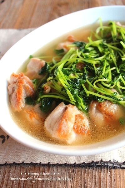 ②油を熱したフライパンで鶏肉の皮を下にして焼き、こんがりと焼き色がついたら裏返し、その上に豆苗を乗せて★をまわしかけ、蓋をして中火のまま3分煮る。