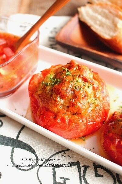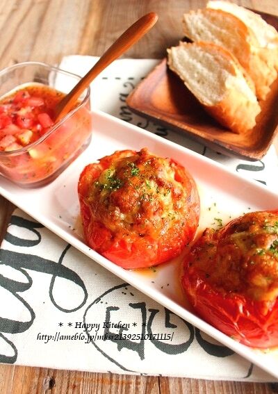 ②トマトの上部分を切り取り、中身をくり抜いて①を詰めてトースターに並べてアルミホイルをかぶせて15分焼く。