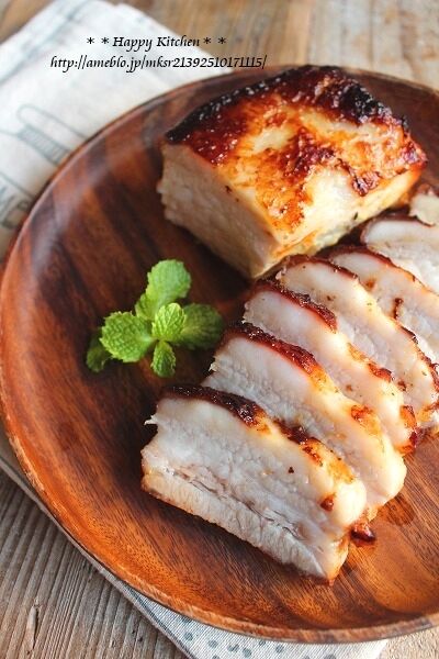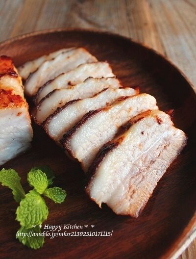 ②脂身を上にして置いてオーブンで40分焼き、30分くらい経って焦げ目がついていたらアルミホイルをかぶせて焼く。