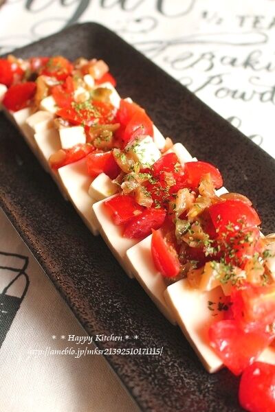 ①ミニトマトは8等分に切り、搾菜はみじん切り、クリームチーズは小さい角切りにし、豆腐以外を全てよく混ぜ合わせる。