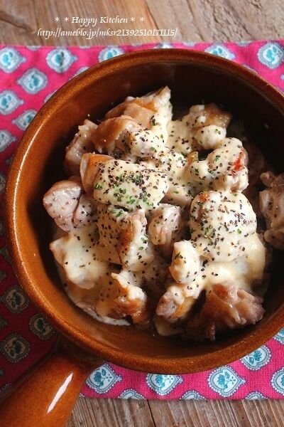 ②鶏肉を取り出して器に盛り、空いたフライパンを軽く拭き取って牛乳と粉チーズを入れて火にかけ、混ぜながら粉チーズが溶けたら火を止める。