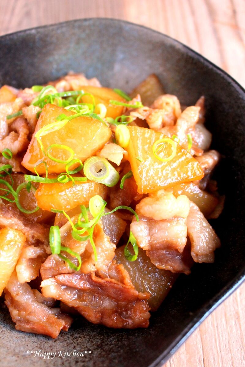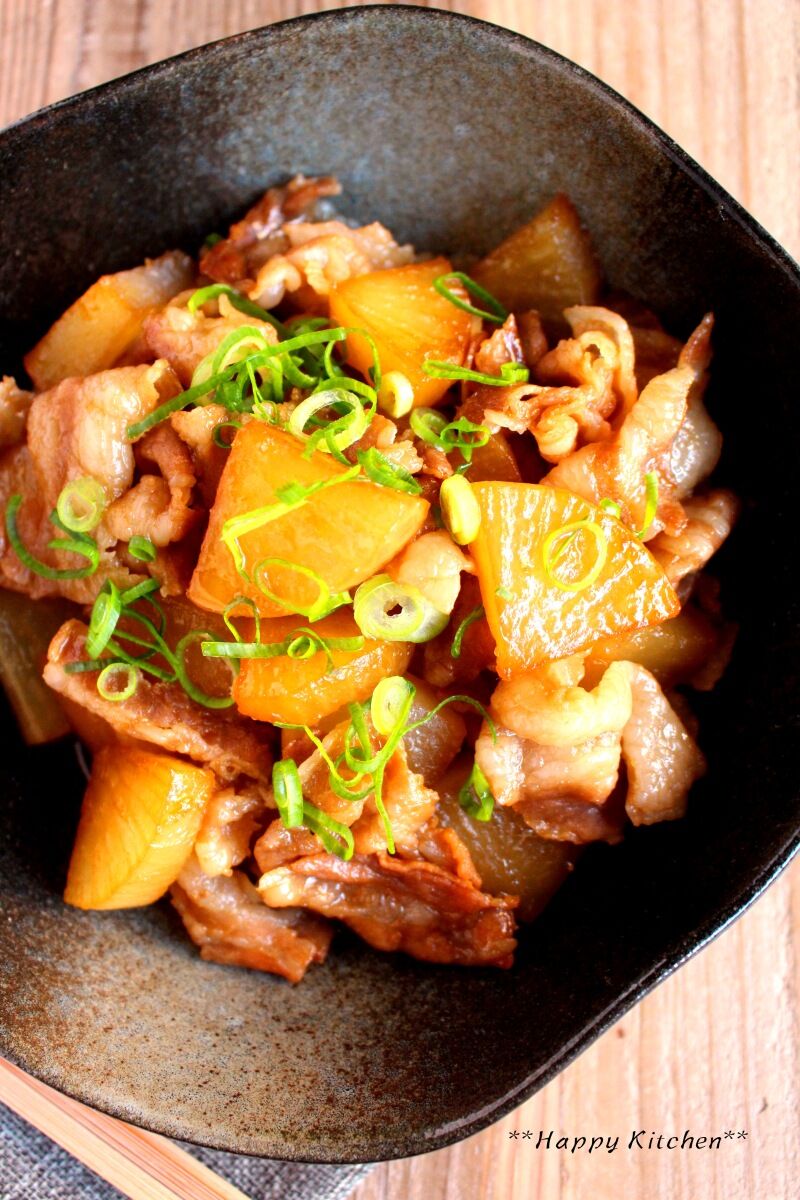 ②豚バラ肉は3~4等分に切って油なしでフライパンで炒める(油がたくさん出たら拭き取って)。色が変わったら大根と★を加えて全体を混ぜる。