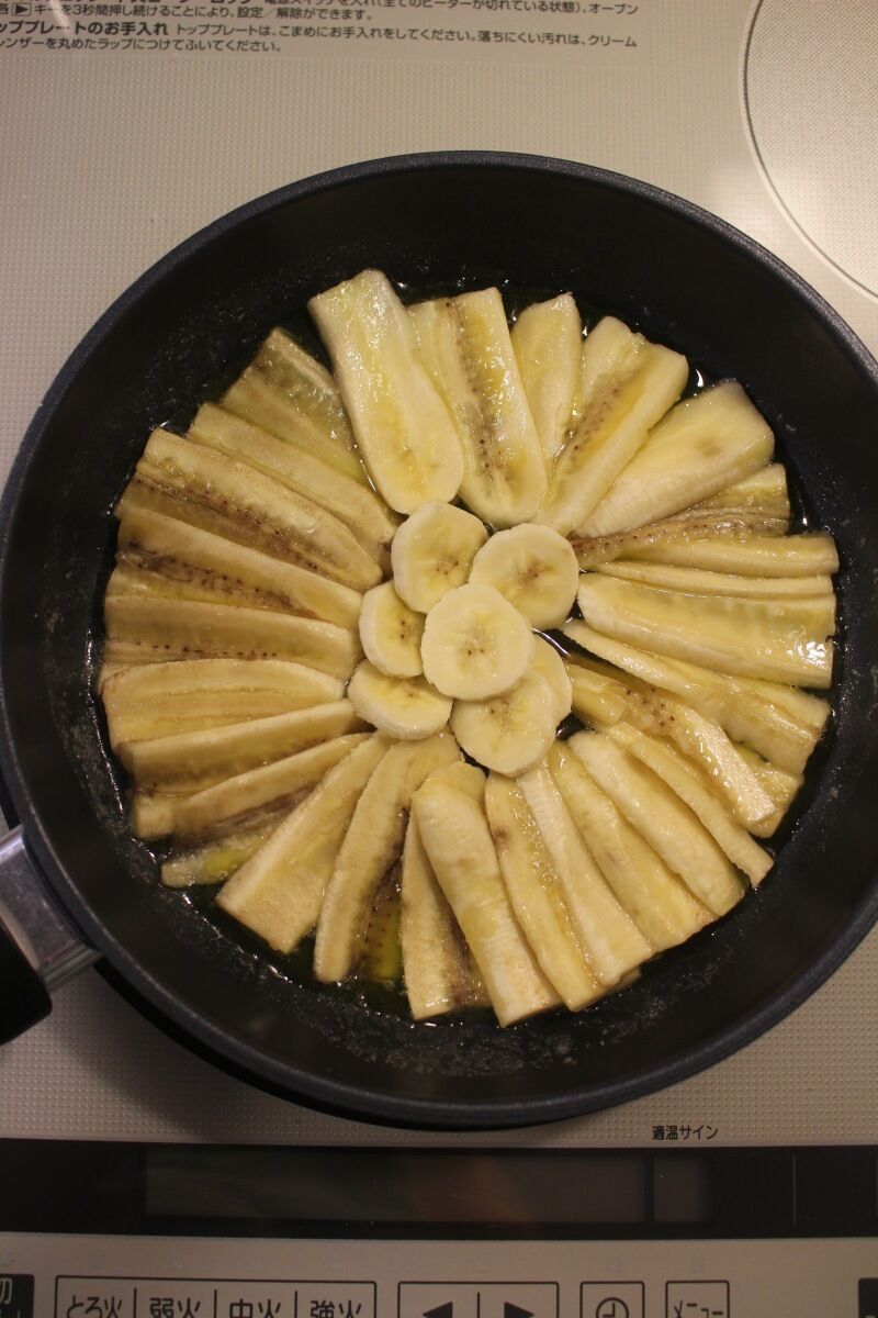 ③スライスしたバナナを②に並べ(火を止めたまま)
