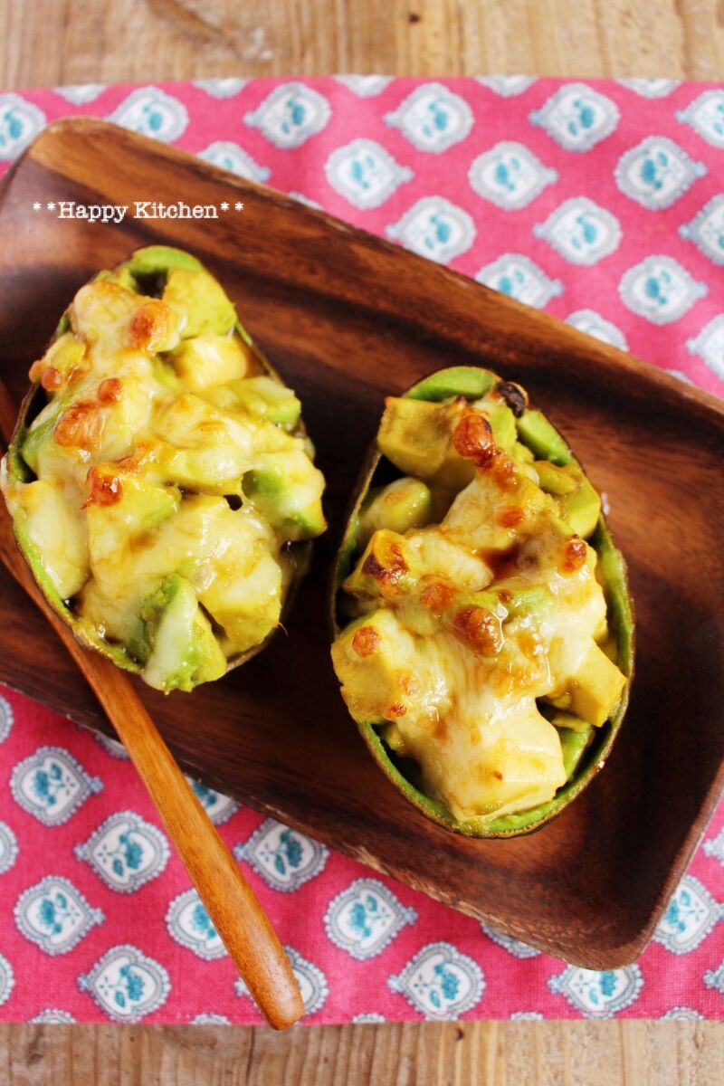 くりぬいたアボカドの皮に入れてピザ用チーズを散らす。