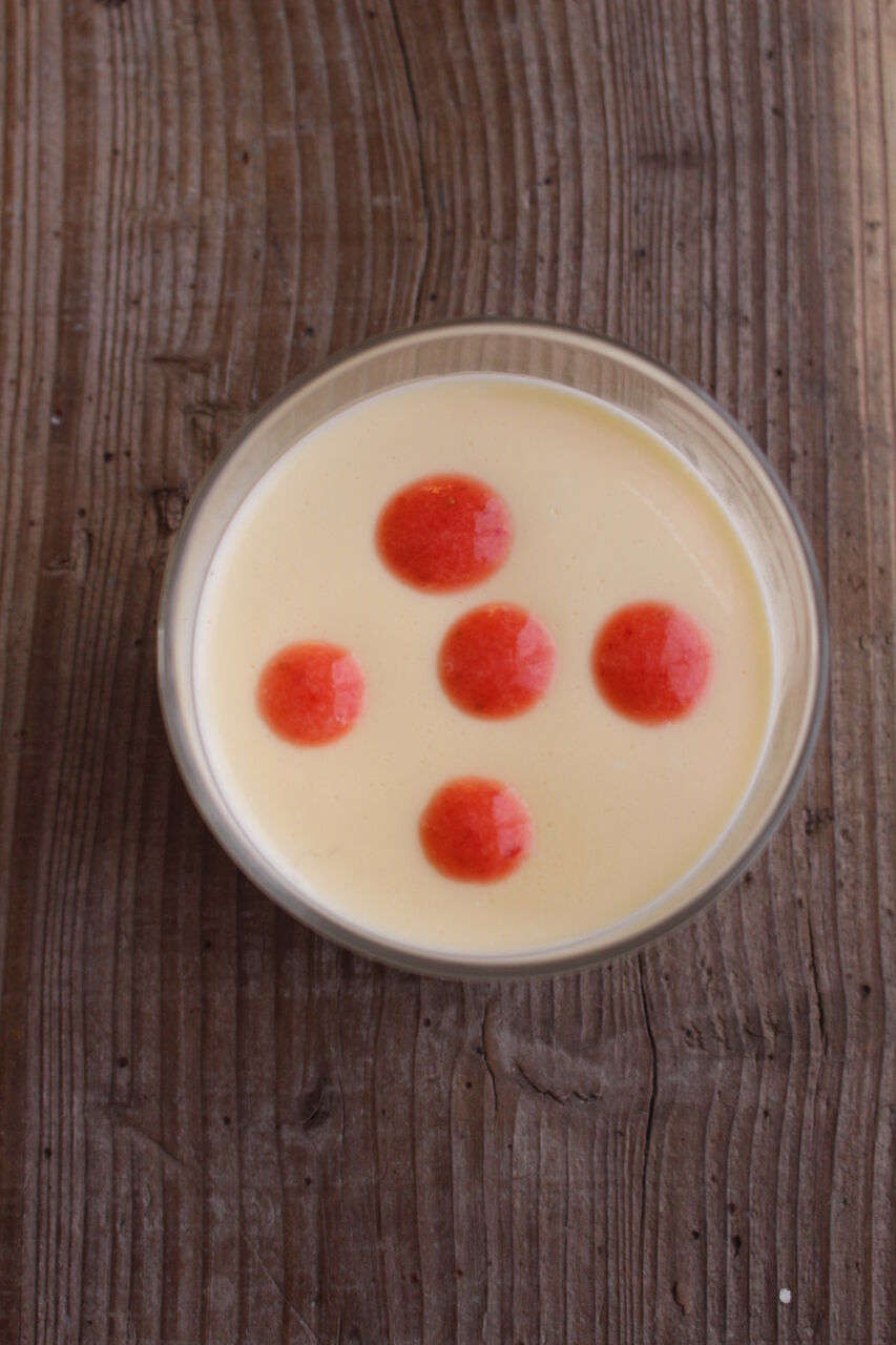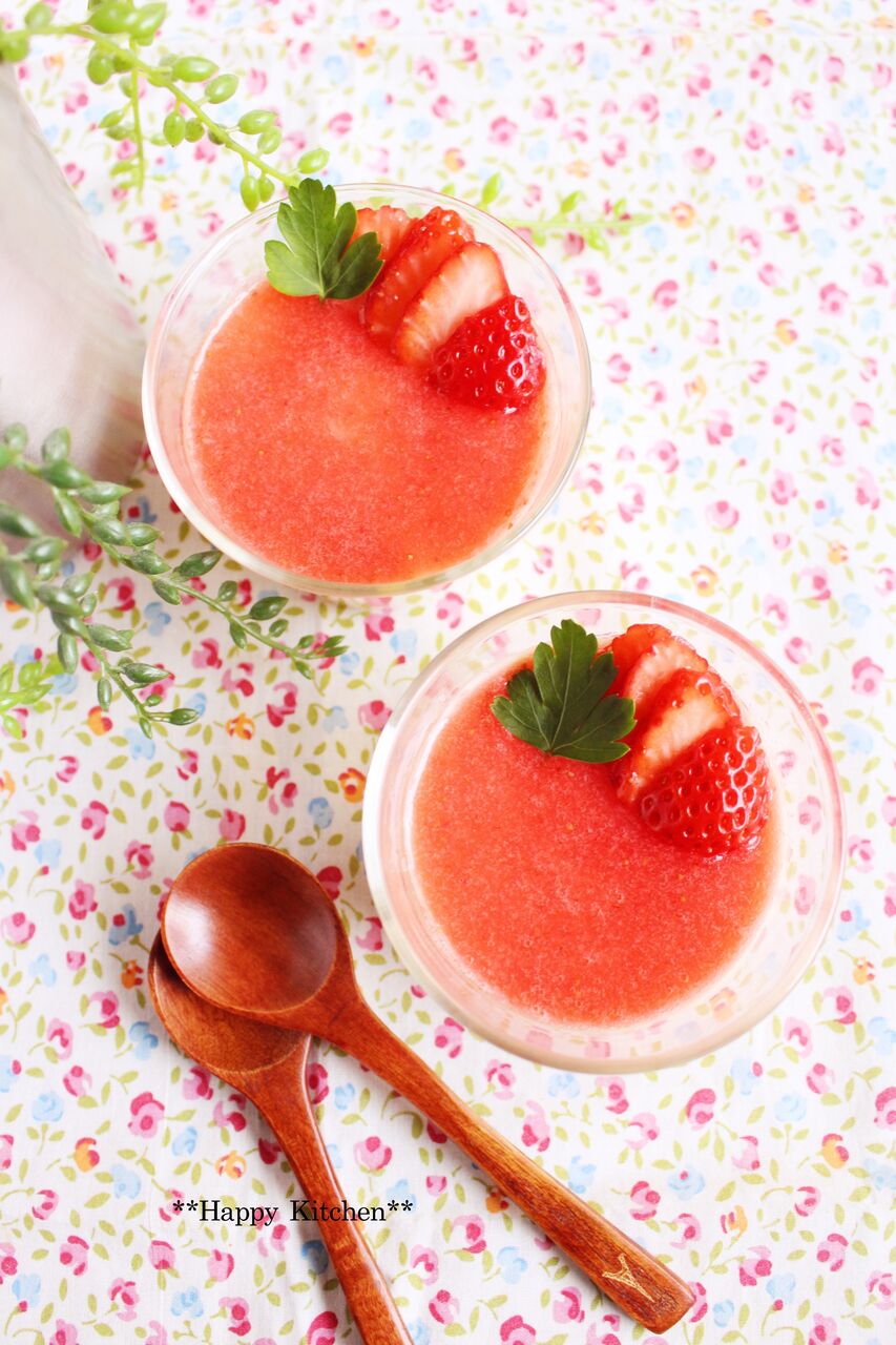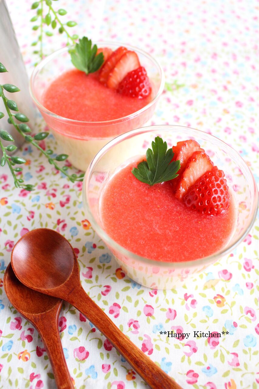 ③粉ゼラチンをレンジで20秒加熱して溶かし、②に入れながら素早く混ぜて容器に流し入れ、冷蔵庫で冷やし、固まったら苺ピューレ(下記)を上に流す。