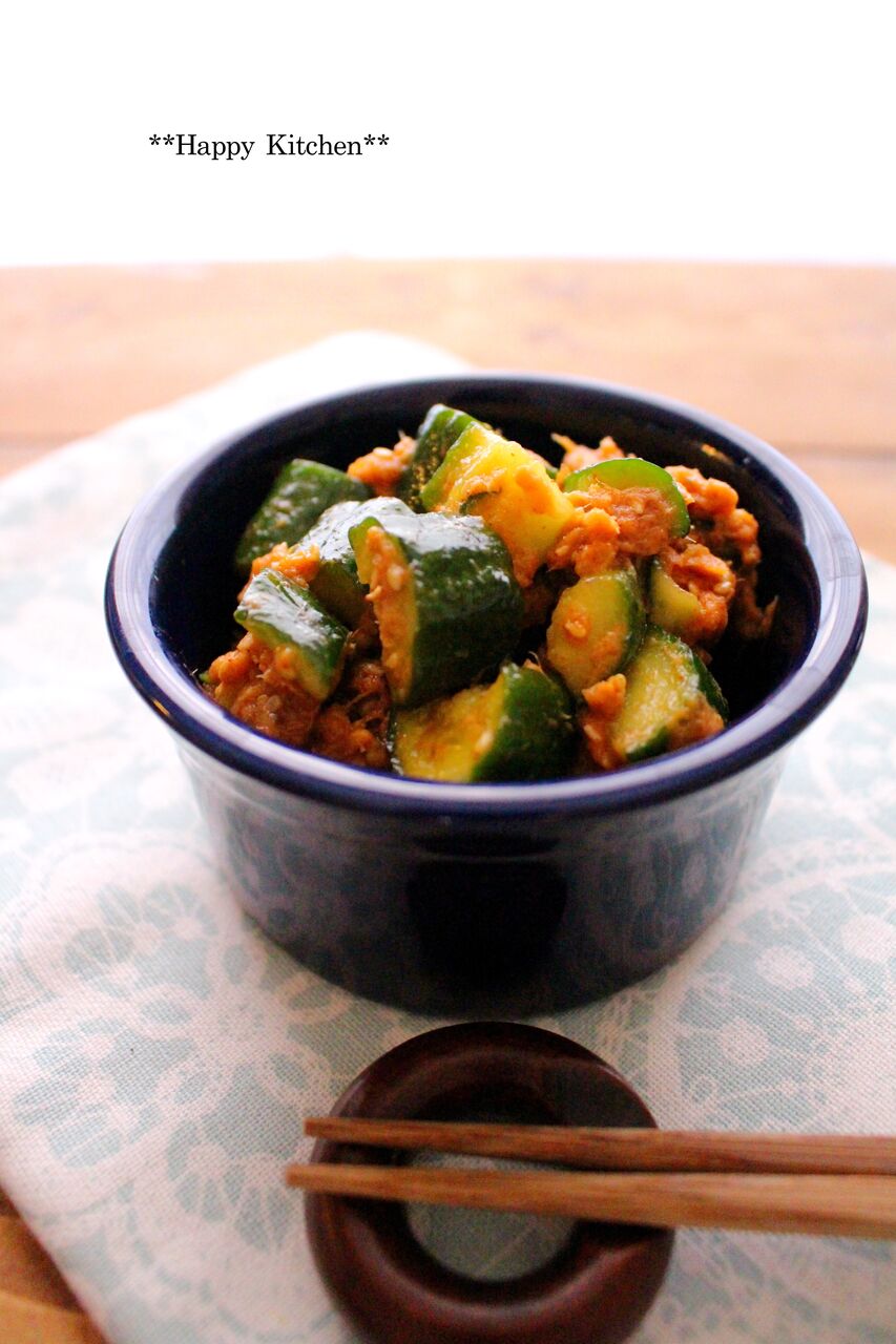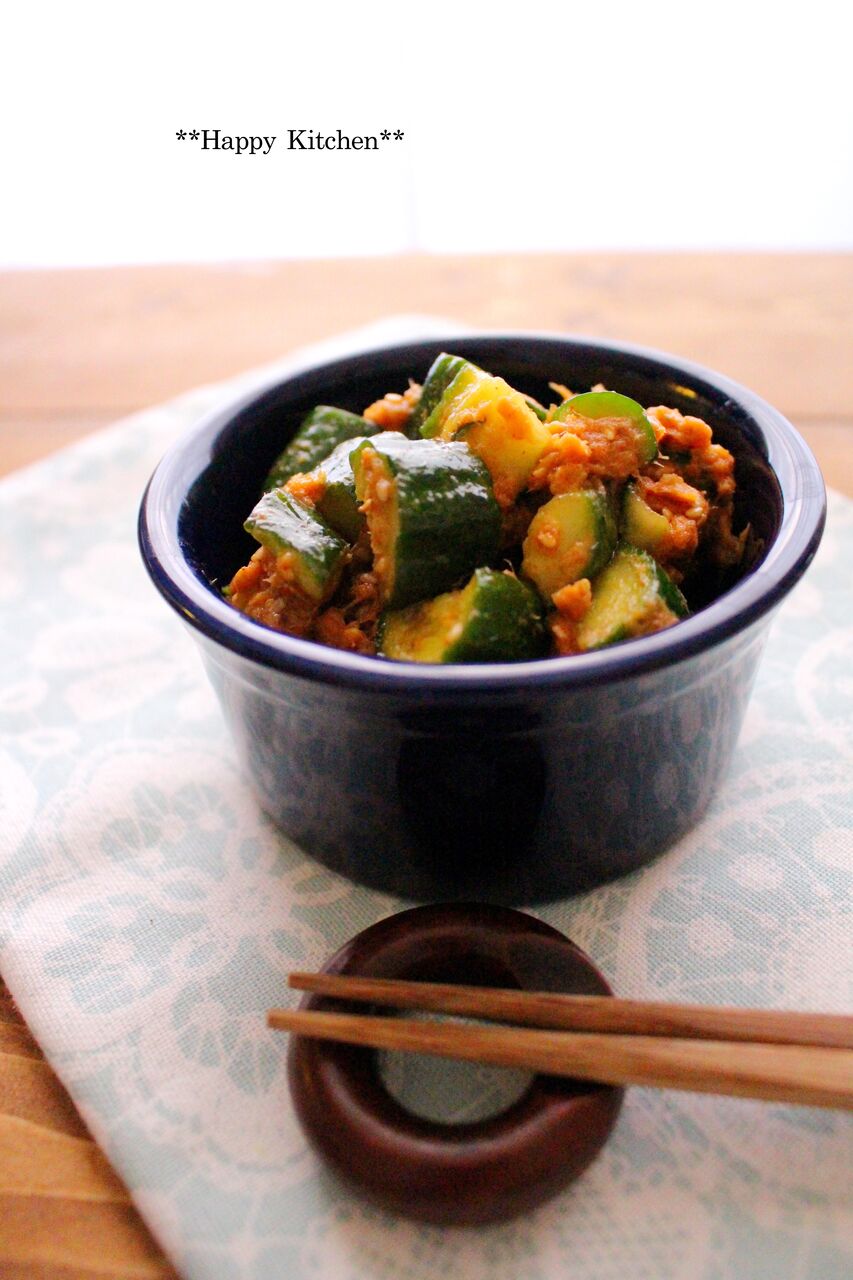 ①きゅうりは麺棒で叩いて中を潰し、適当な大きさに切る。ツナはオイルを切っておく。