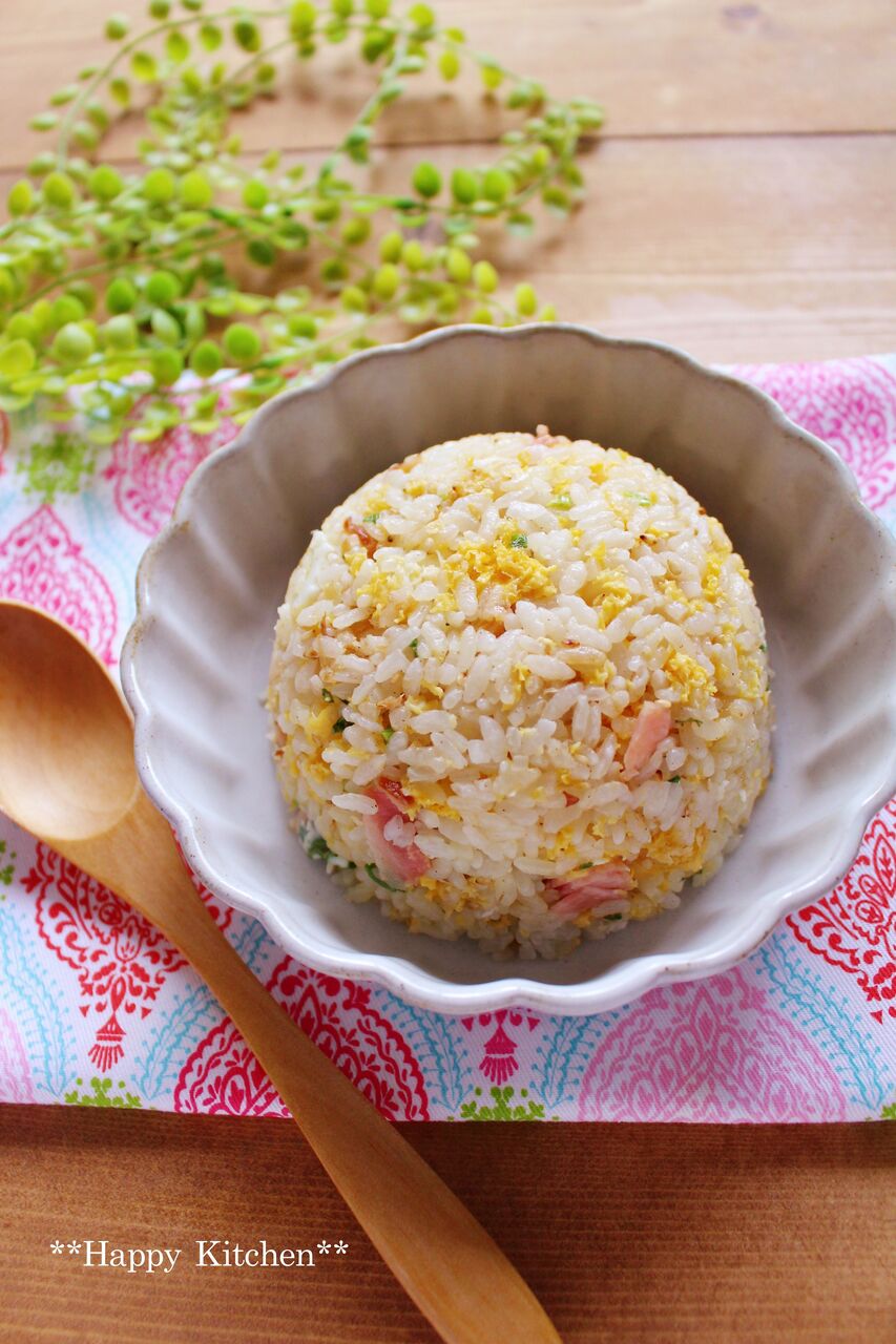 ①耐熱容器にご飯を平らに敷き詰め、※をまわしかける。その上に1cm角に切ったベーコンとネギを全体に散らし、溶き卵を上からかけてふんわりラップをかけ、600wのレンジで5分加熱する。