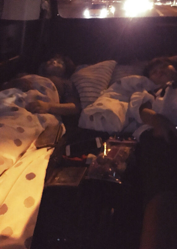 子供達は後部座席をフルフラットにして枕を置いてベッドにして眠り、