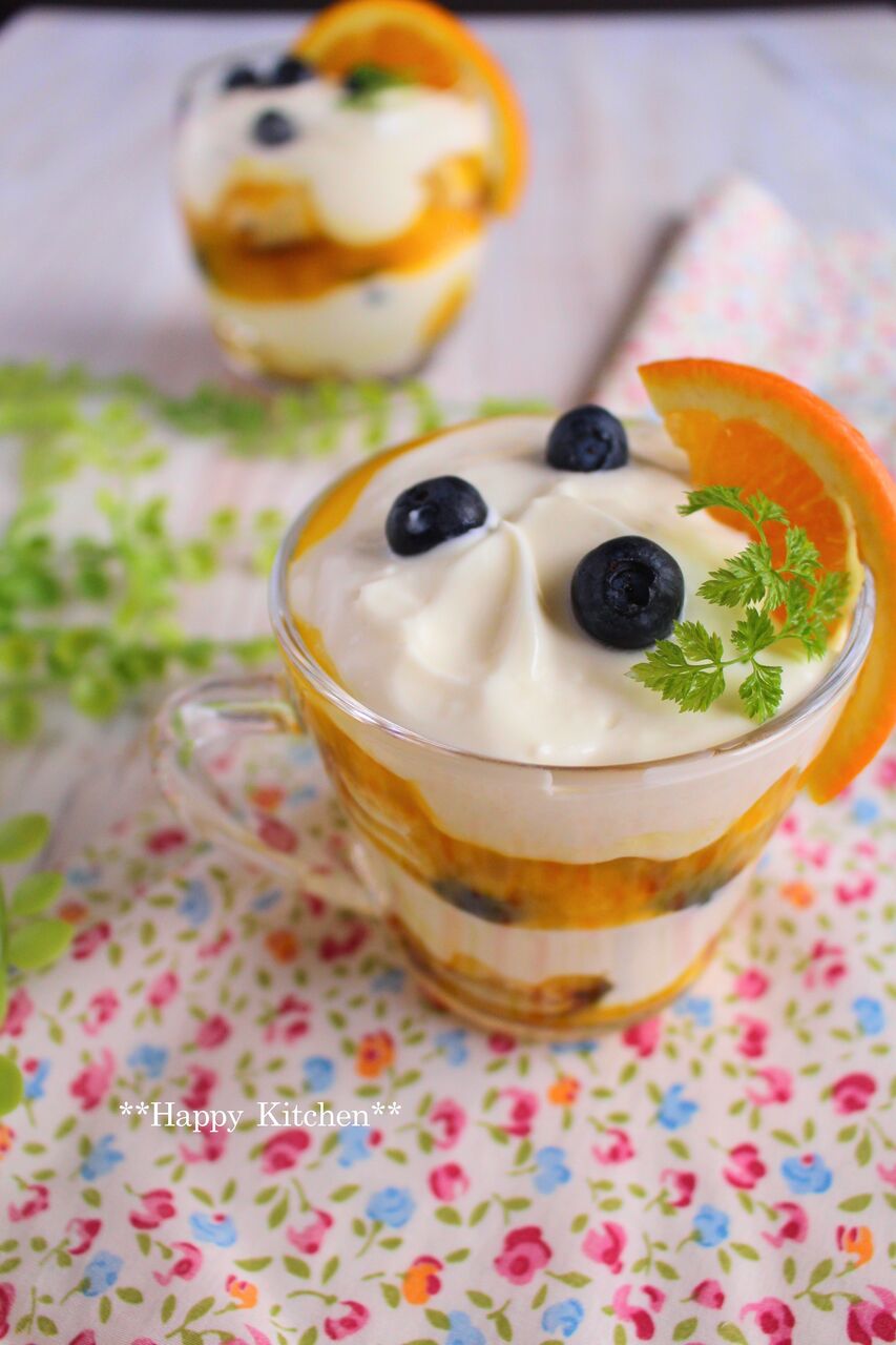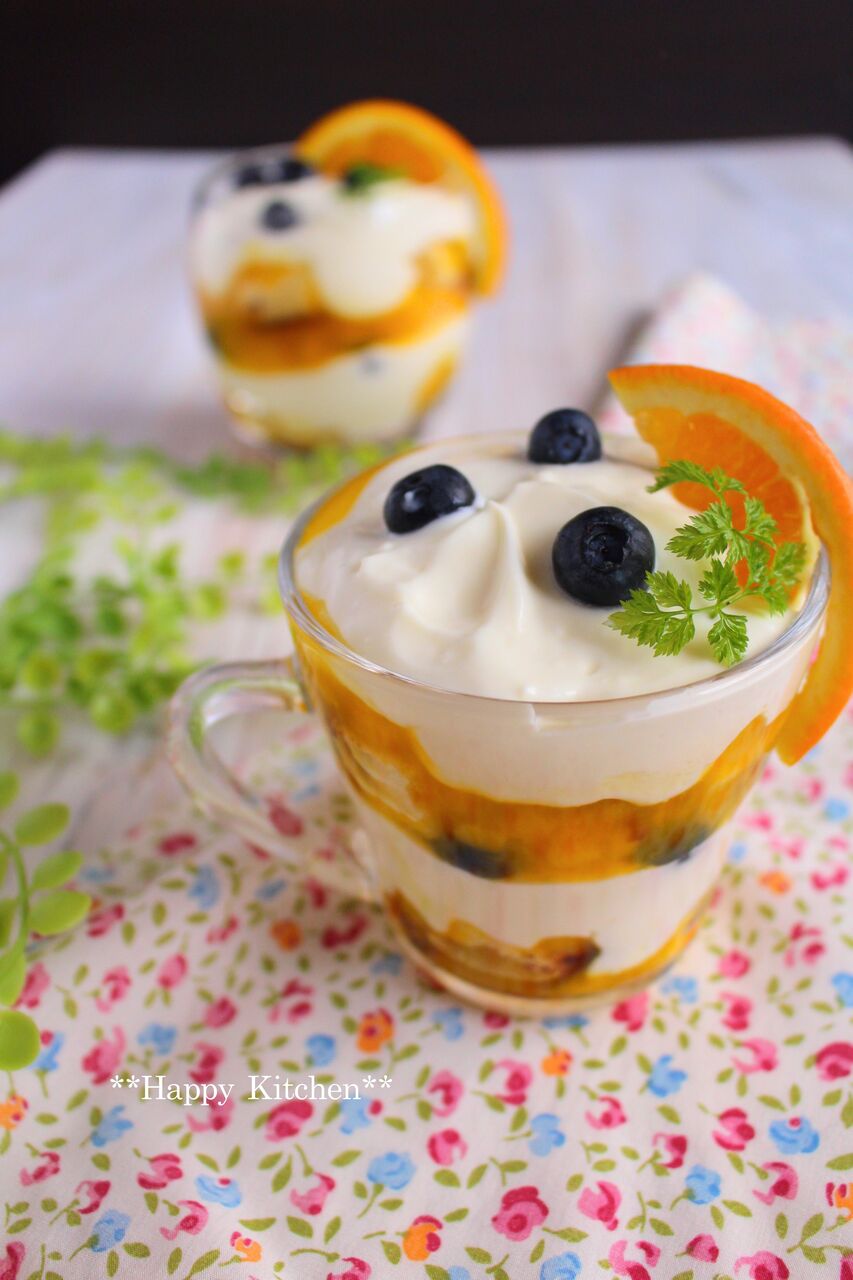 ③最後ヨーグルトクリームをかけてからしばらく冷蔵庫で冷やしてからオレンジやブルーベリーを飾りつける。