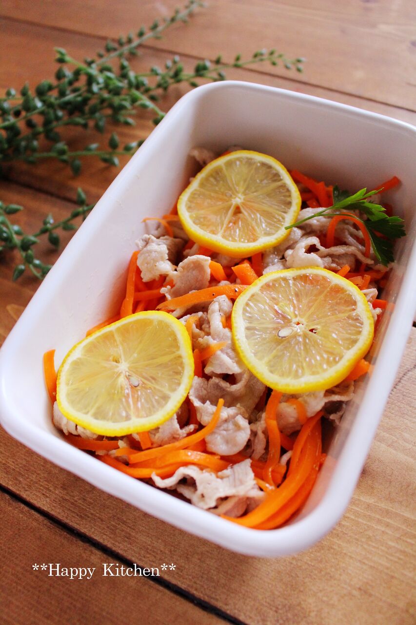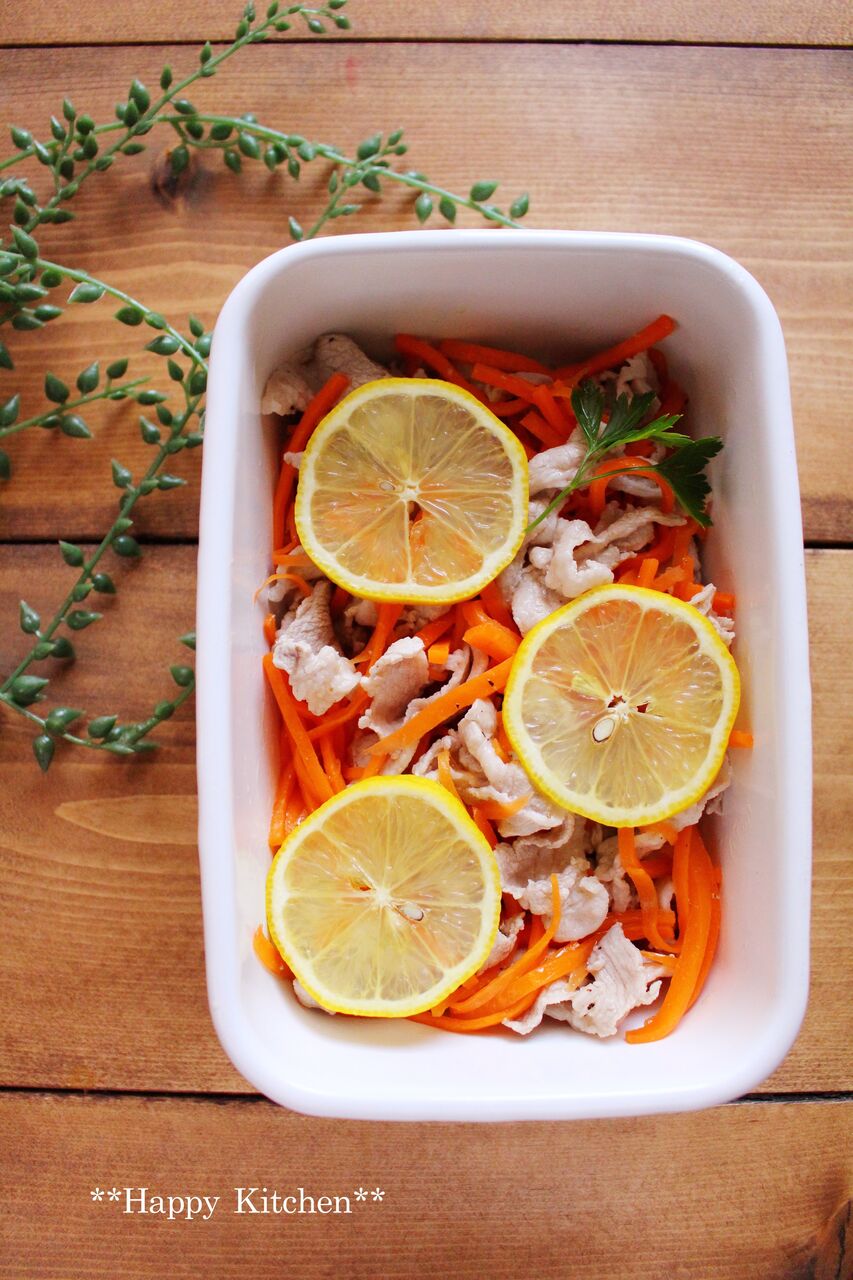 ②豚肉はお湯でさっと茹でてザルにあげて水気を切り、温かいうちにAに入れてよく和え、①を加えてさらに混ぜて容器に移し、レモンの輪切りを乗せる。(1時間~食べごろです)
