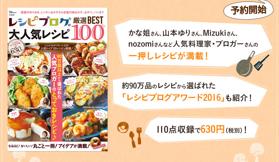 「レシピブログの大人気厳選BEST100」の予約が開始されました、というお知らせなんですが、
