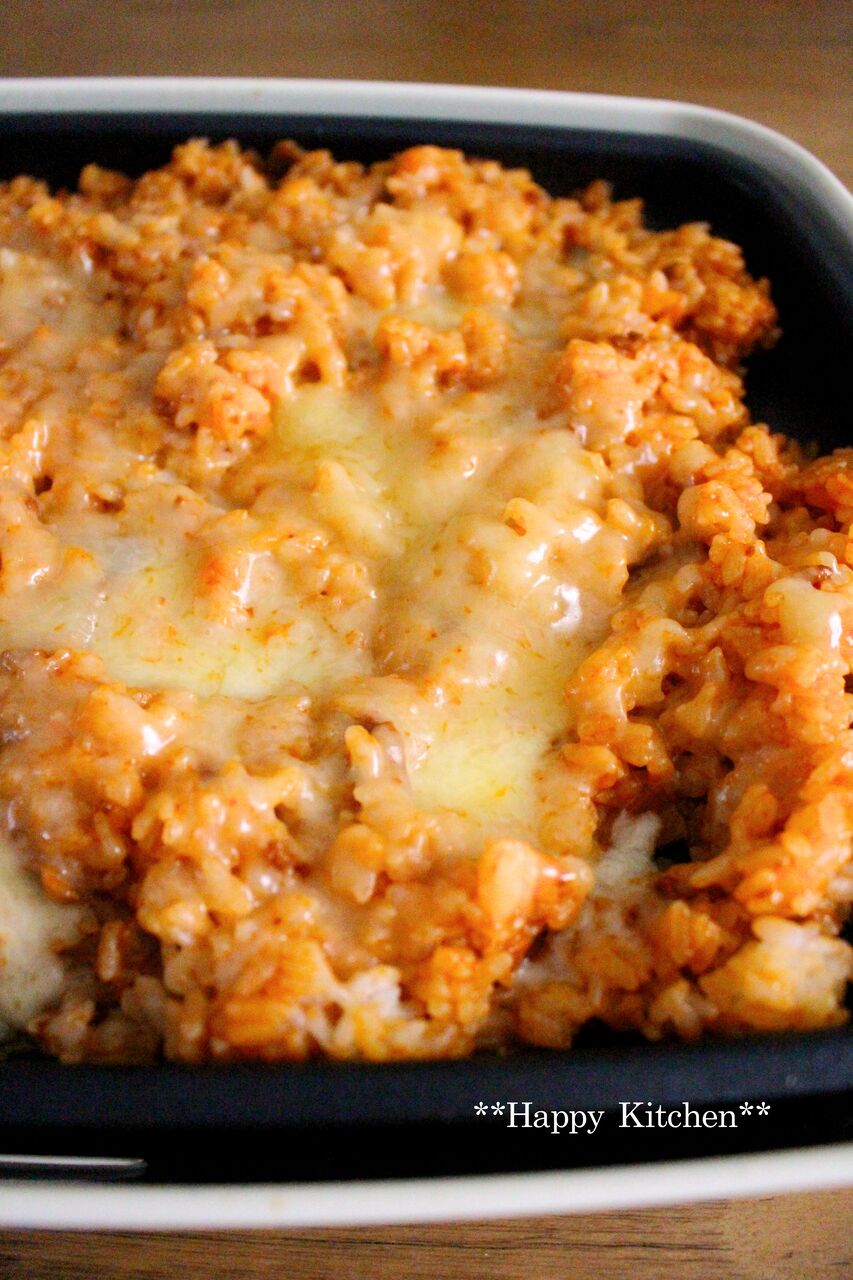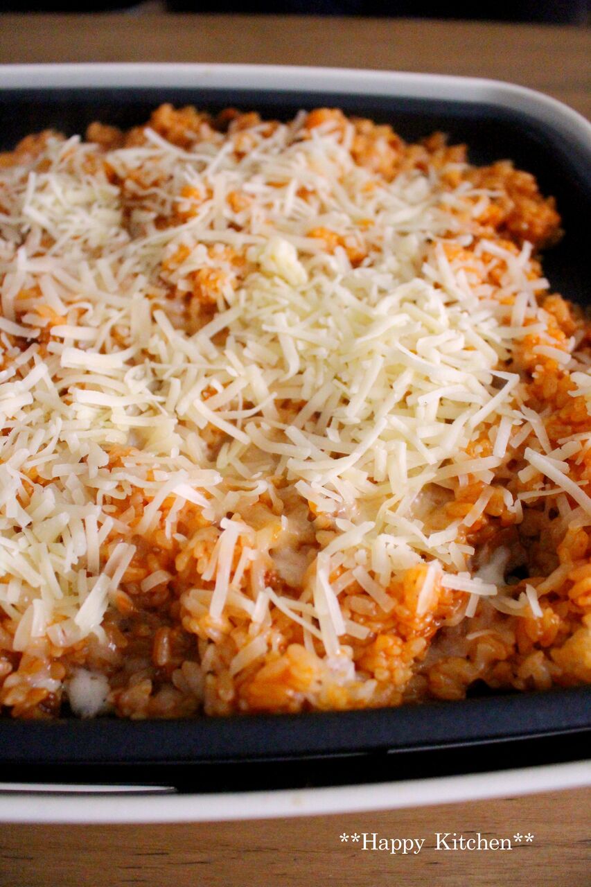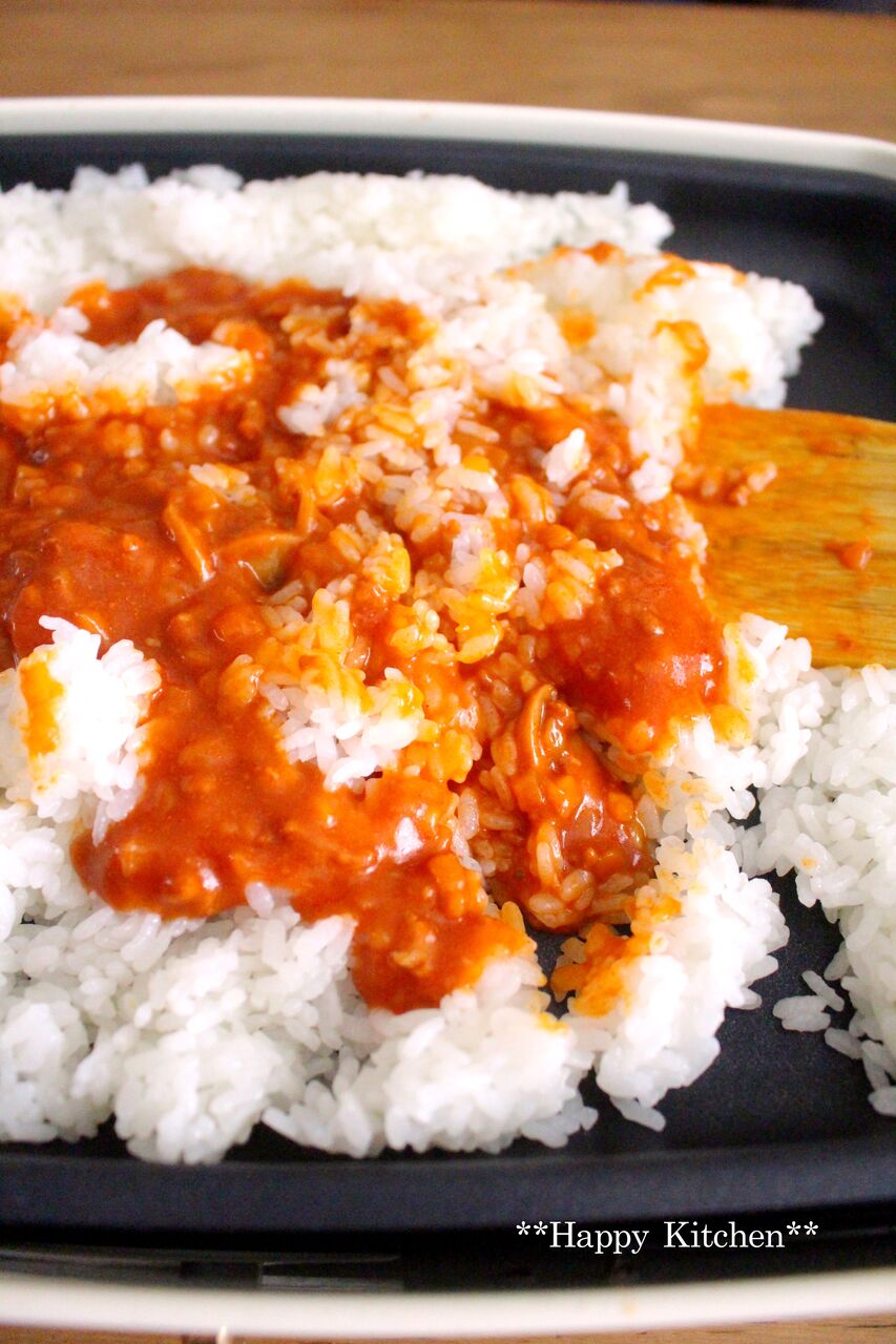 サラダ油を熱したホットプレートに3人分のご飯を入れて、上からミートソースをかけます。(ミートソースは1缶)