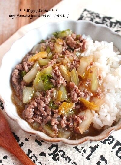 1.白菜は粗いみじん切りにする。サラダ油大さじ1/2(分量外)を熱したフライパンでひき肉、生姜、にんにくを炒める。ひき肉の色が変わったら白菜を加えて炒める。
