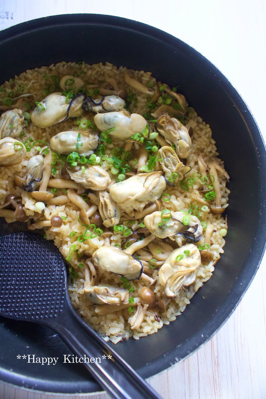 ③炊飯器に牡蠣の煮汁を入れて2合の水位になるように水を足して混ぜ、しめじを乗せて普通に炊き、炊き上がったら牡蠣を加えてそのまま10分蒸らし、蒸らし終わったら塩を振って混ぜ味を調える。