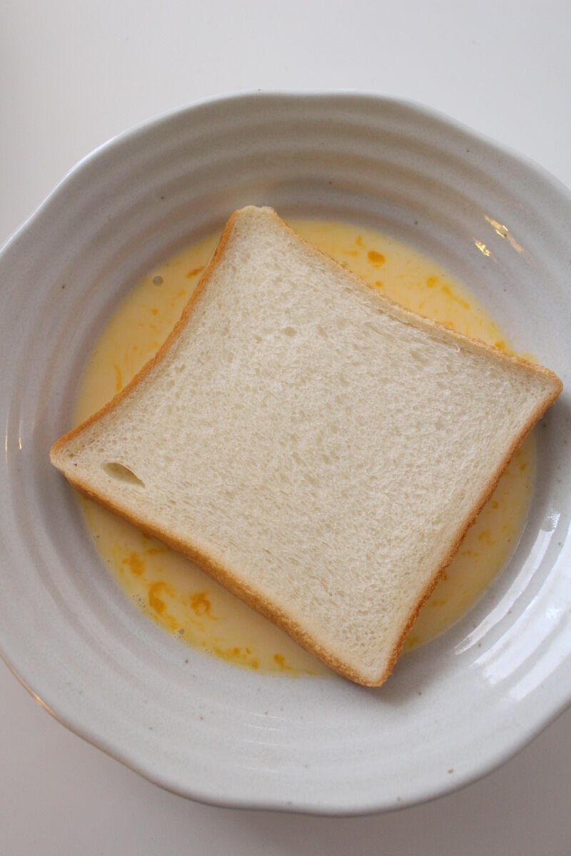 ①※をよく混ぜて食パンが入る大きさの器に入れて片面各3分位ずつ、両面を浸す。(写真は片面だけですが両面浸します)りんごはスライスする。