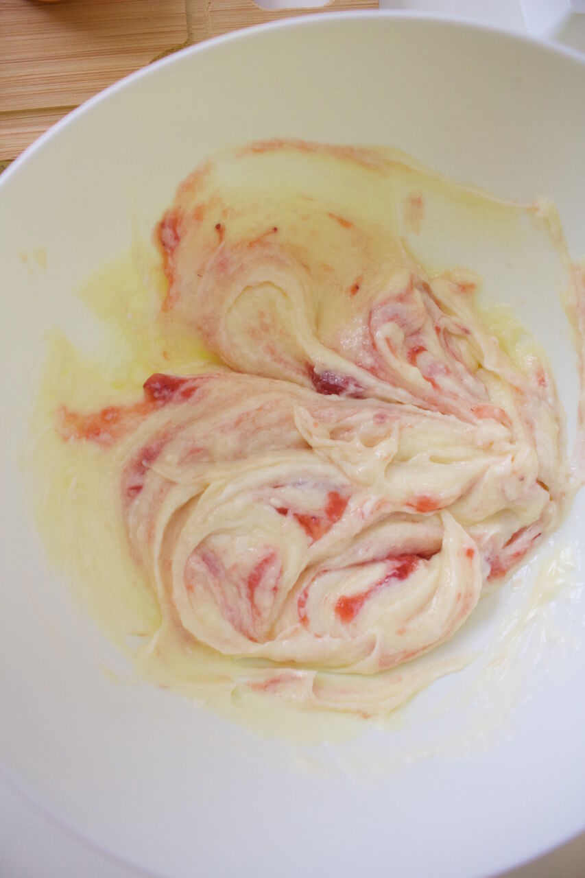 ③ホワイトチョコをクリームチーズのボウルに入れてよく混ぜ、苺ジャム(だいたい大さじ2くらい)を加えてざっくり混ぜる。