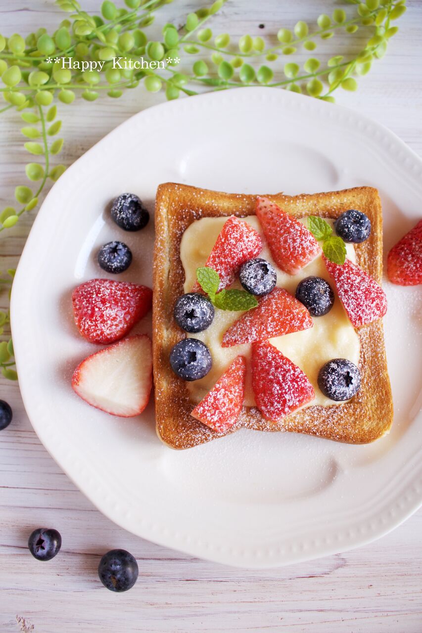 焼いた食パンにカスタードを乗せて、苺とブルーベリーを乗せて