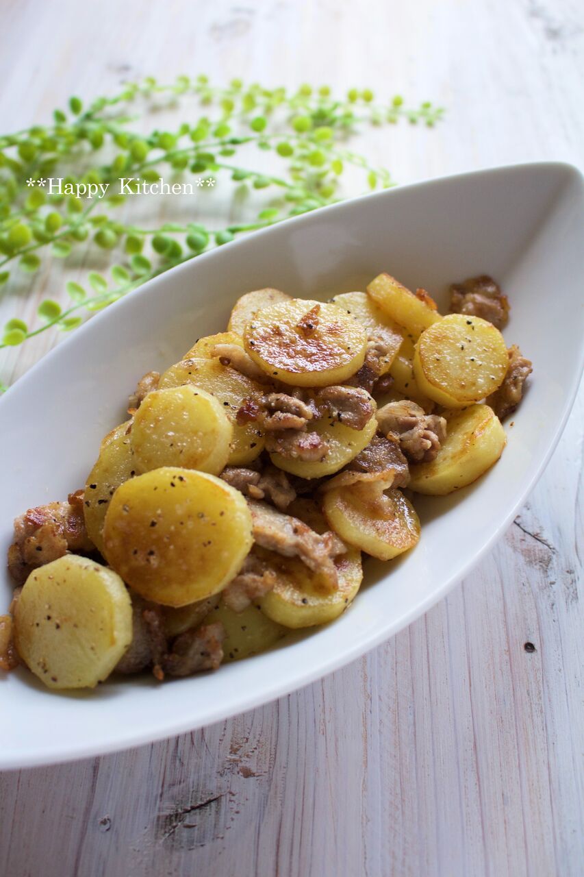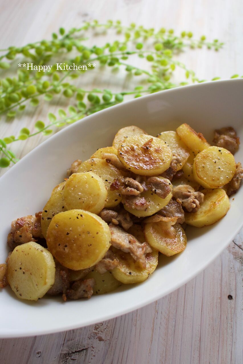 ①じゃがいもは皮をむいて1cm幅の輪切りにする。(大きいものは半分に切って)豚肉は小さく切る。油なしで熱したフライパンで豚肉を炒め、カリカリになって来たら一旦取り出す。(この時キッチンペーパーなどを敷いて油を切るとなお良い)