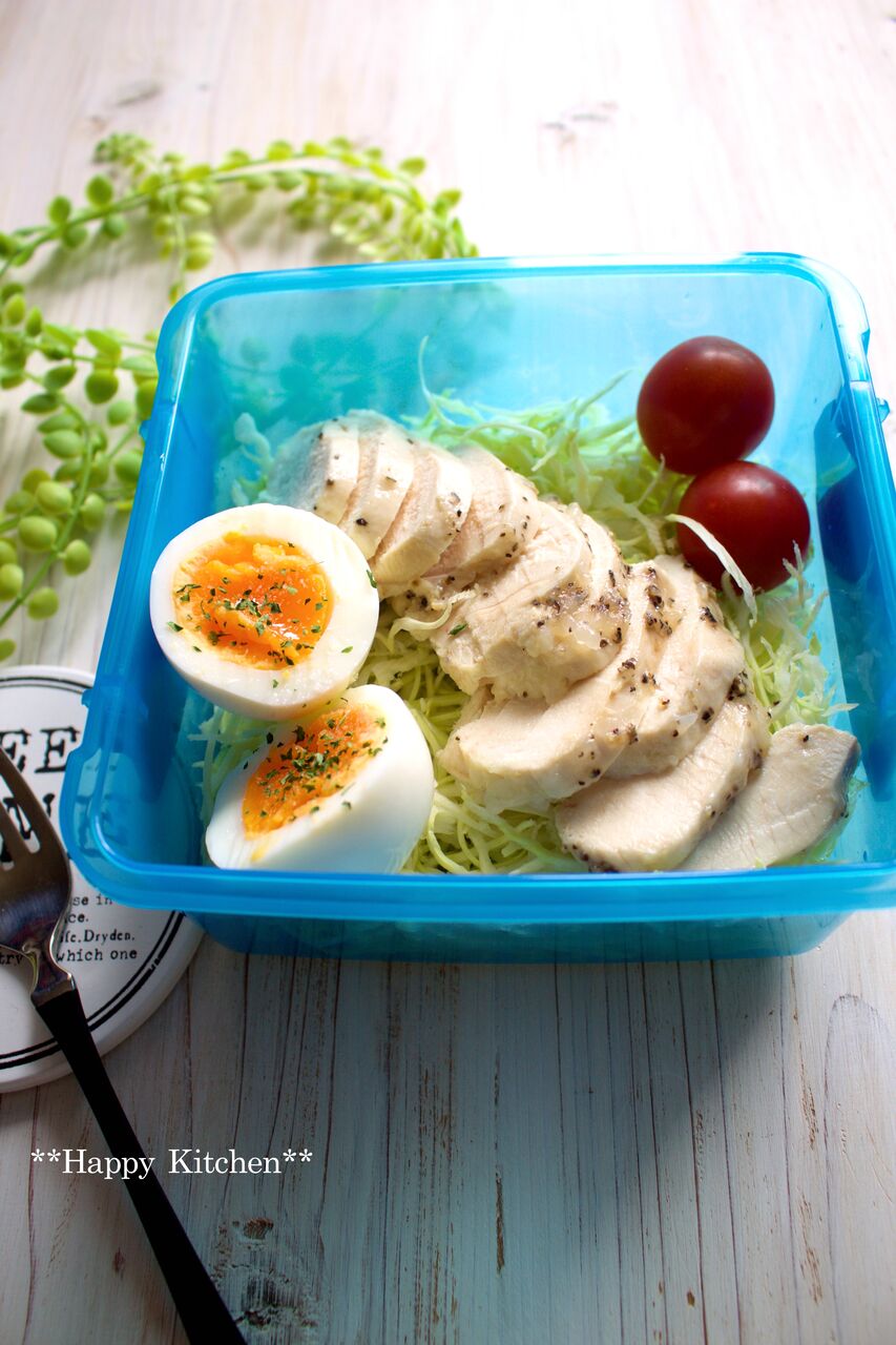 千切りキャベツ、コンビニ風サラダチキン(鶏肉本より)、ゆで卵。