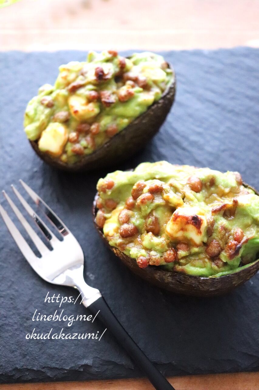 ①アボカドは縦半分に切り、種を取って身をくり抜き、身はフォークなどで潰して納豆と付属のタレとわさびを加えてよく混ぜる。