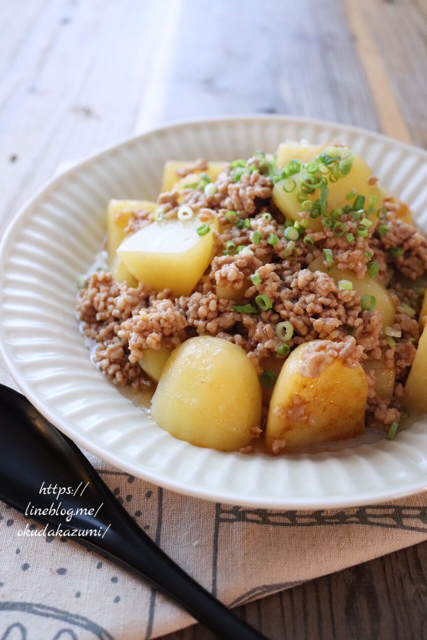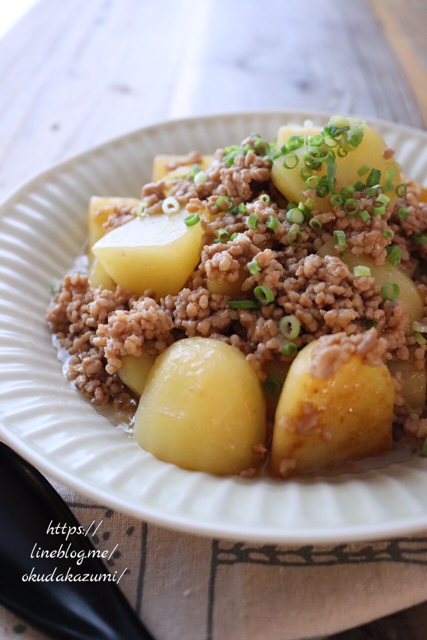①じゃがいもを耐熱容器に並べてふんわりラップをかけ600wで5分加熱する。その間にフライパンでひき肉を炒め(油はひかずに)色が変わったら出た脂を拭き取り、じゃがいもを加えて炒める。