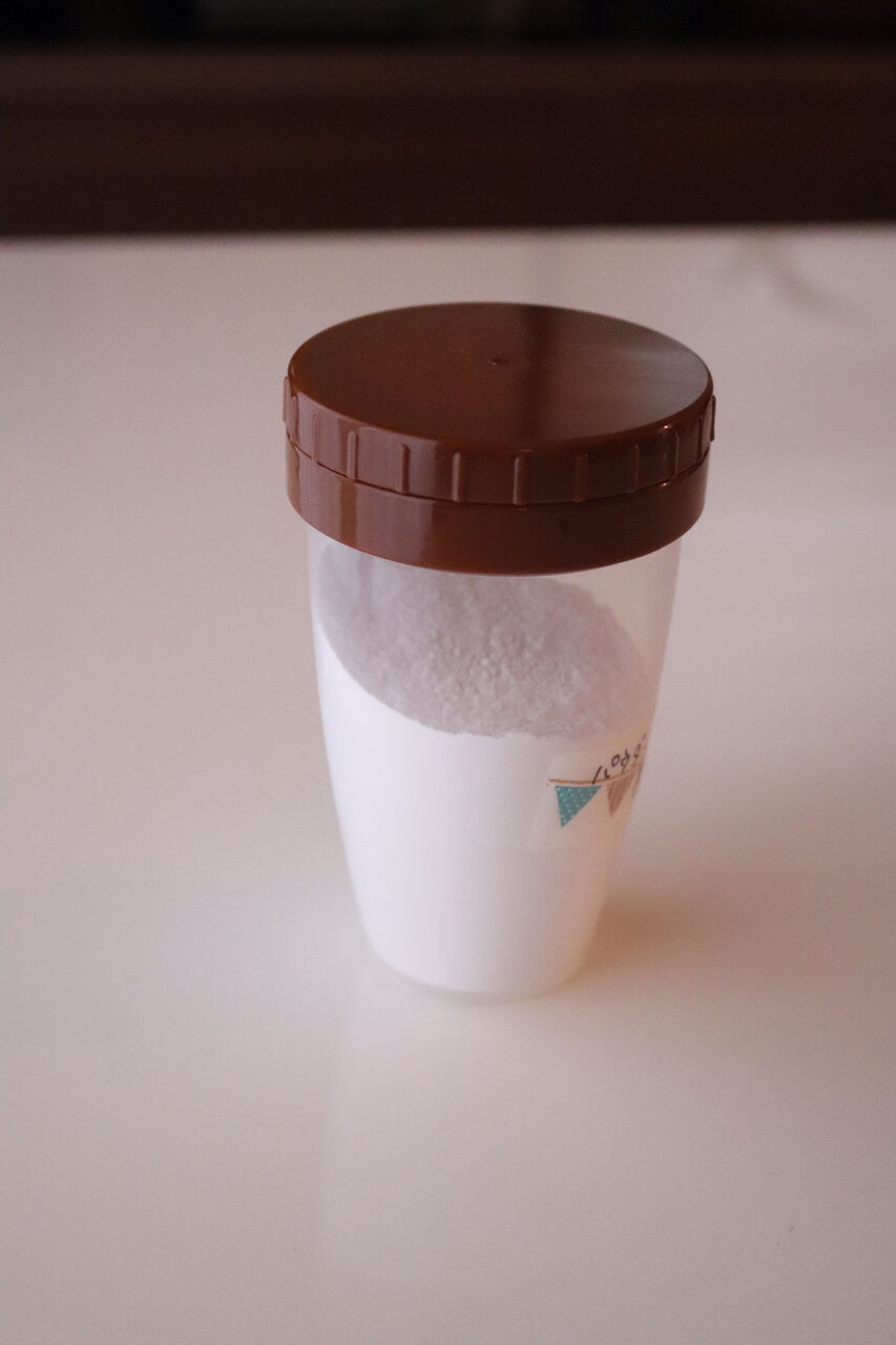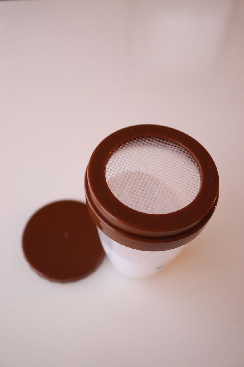 粉砂糖をドサッと容器に入れてそのまま冷蔵庫で保存、必要な時に蓋を取ってササッと振ったらいいだけっていう。