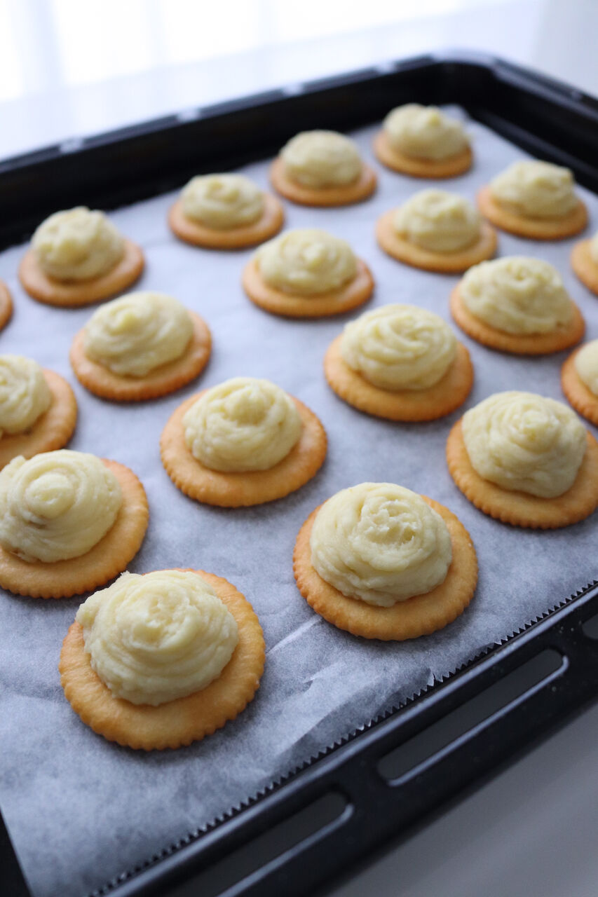 ③リッツをオーブントレイの上に乗せてクリームを絞り出し、