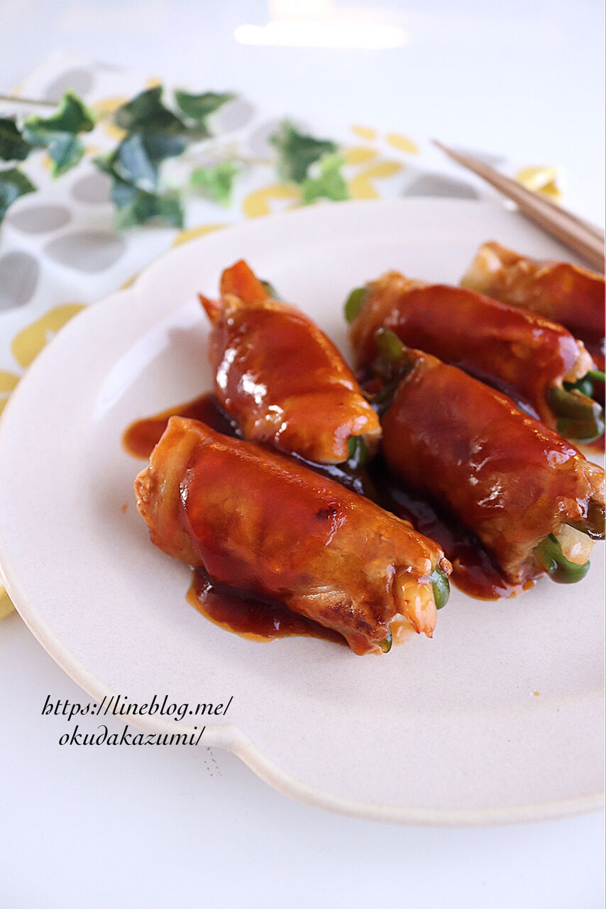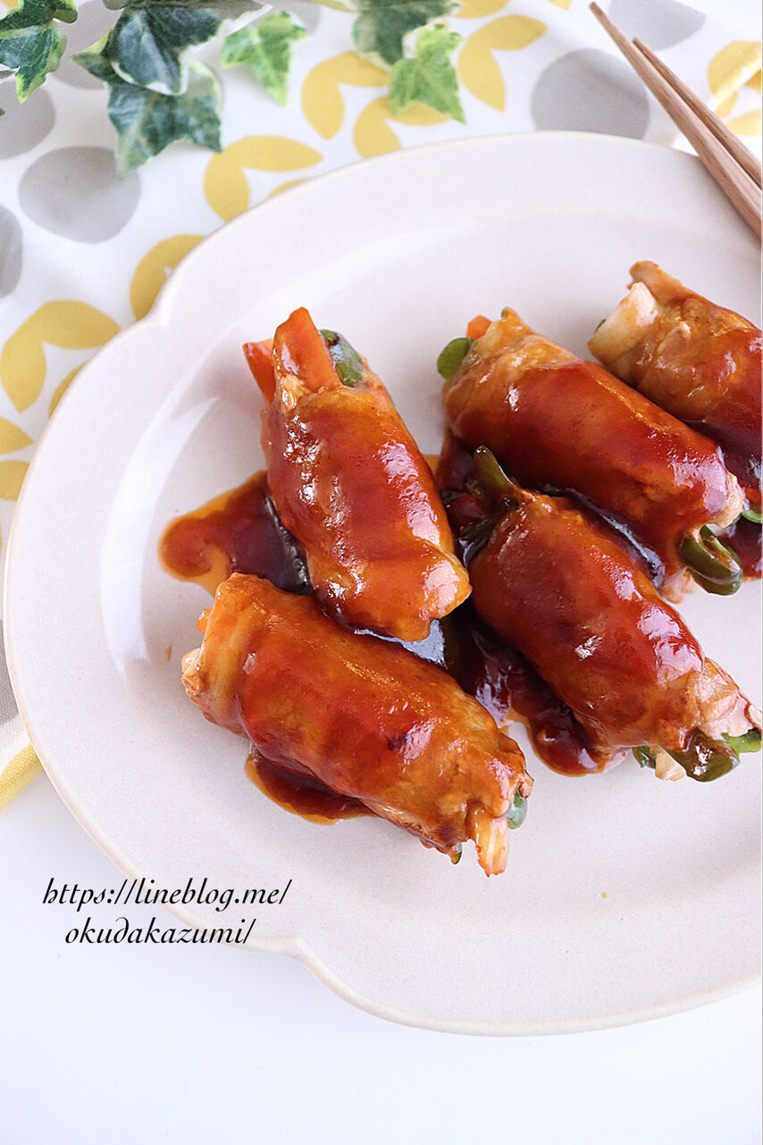 これをくるくる巻いて、酢豚味のタレでからめています。