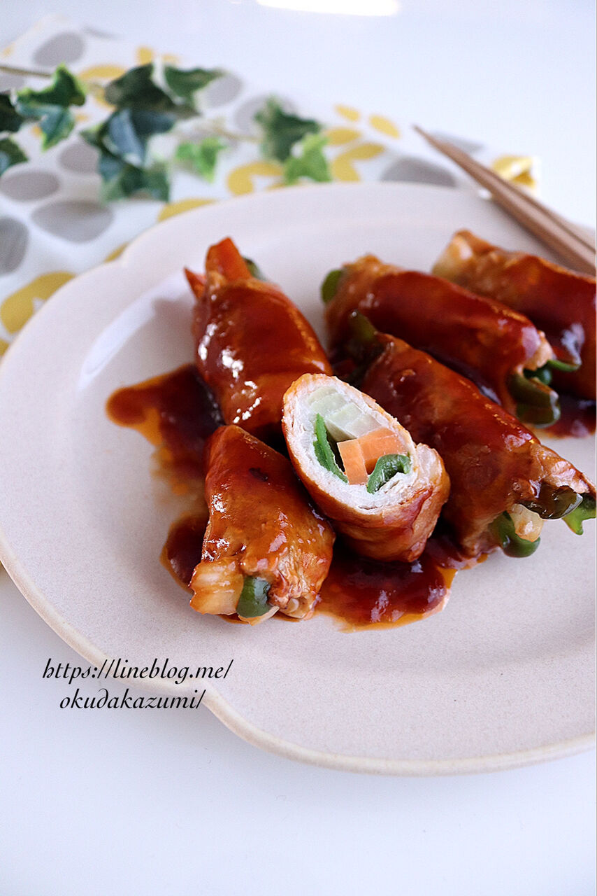 豚肉ロールの中身は酢豚の具材のピーマン、にんじん、玉ねぎ。