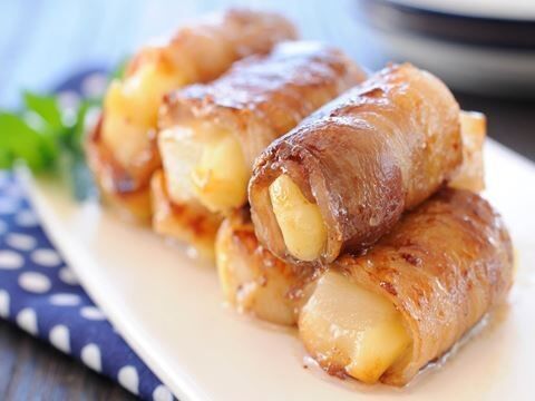 ①お餅とチーズをそれぞれ縦4等分に切り、お餅とチーズをで豚肉で巻く。これを8個作る。