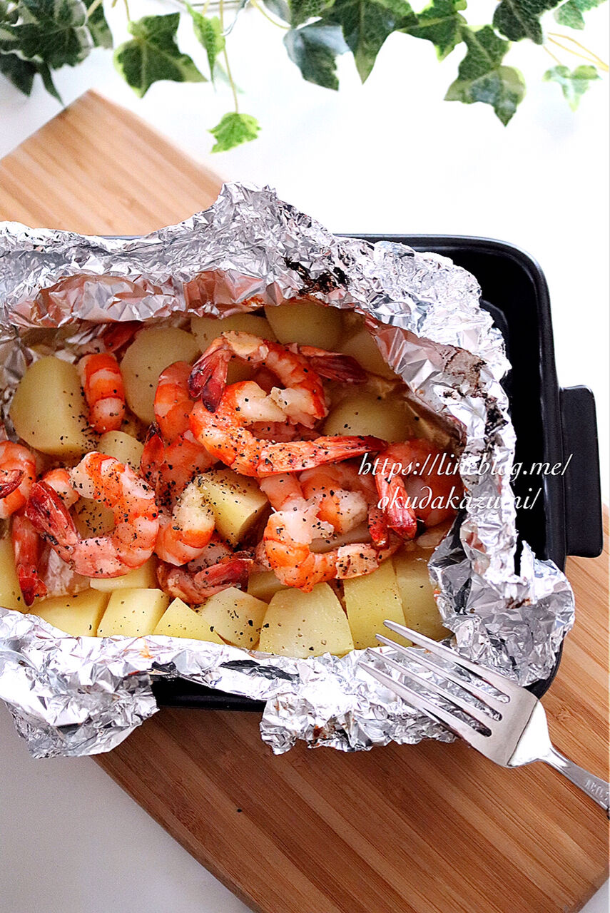 ①海老に酒(分量外)を振ってもみ、水で洗い流す。じゃがいもは水にさらして(サッと洗う程度でOK)耐熱容器に並べ、ふんわりラップをかけて600wで4分加熱する。