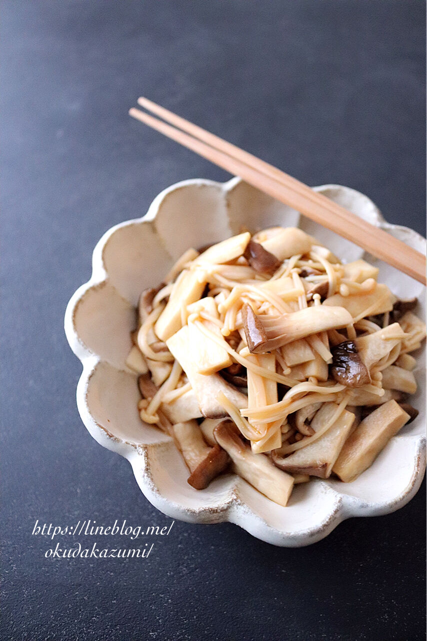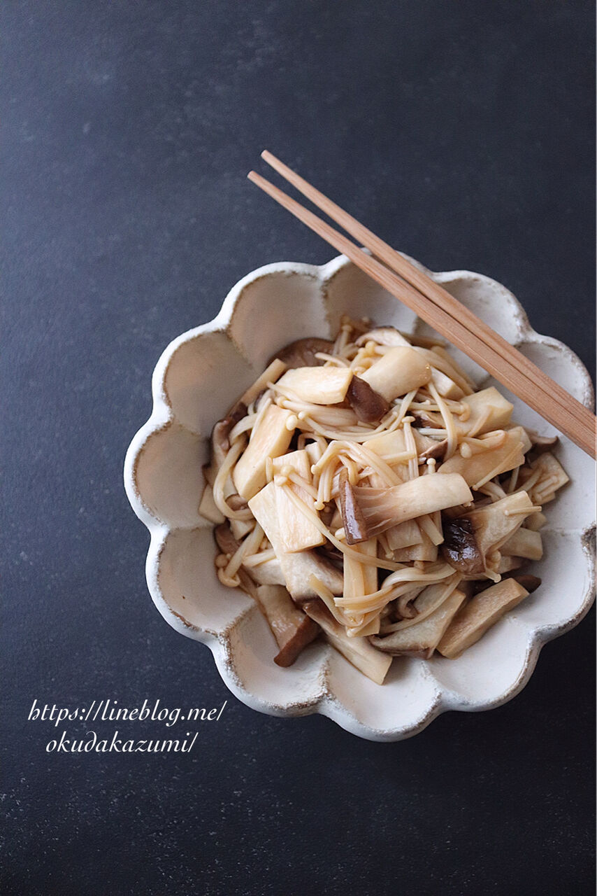 ①耐熱容器にきのこを広げて入れ、Aをまわしかけてふんわりラップをかけて600wのレンジで4分加熱し、よく混ぜる。