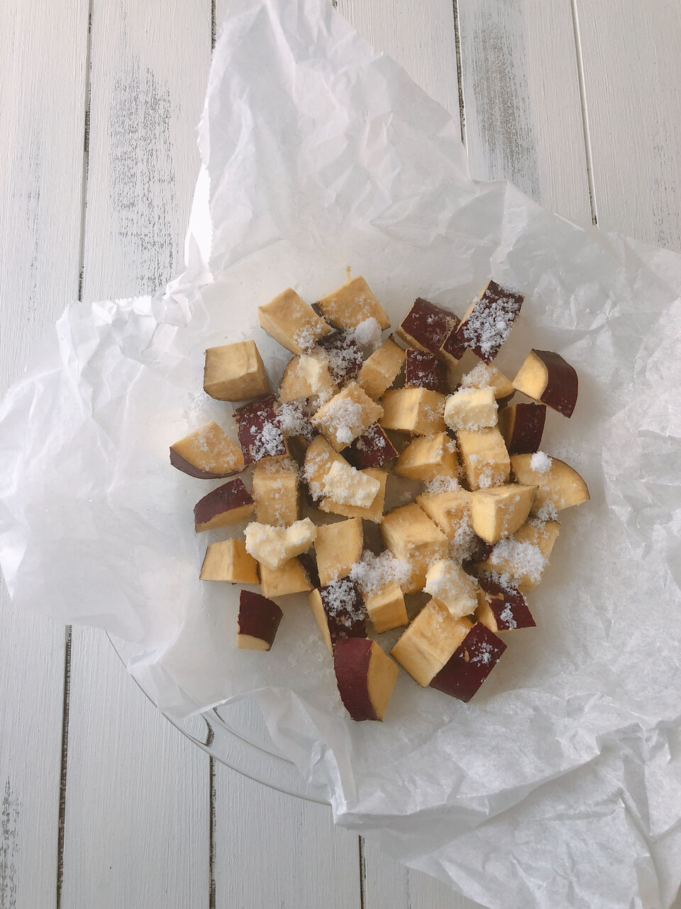 ②耐熱容器にクッキングシートを広げて①を乗せ、上からAを振り入れる。(バターはちぎって数カ所に散らした方がいいです)