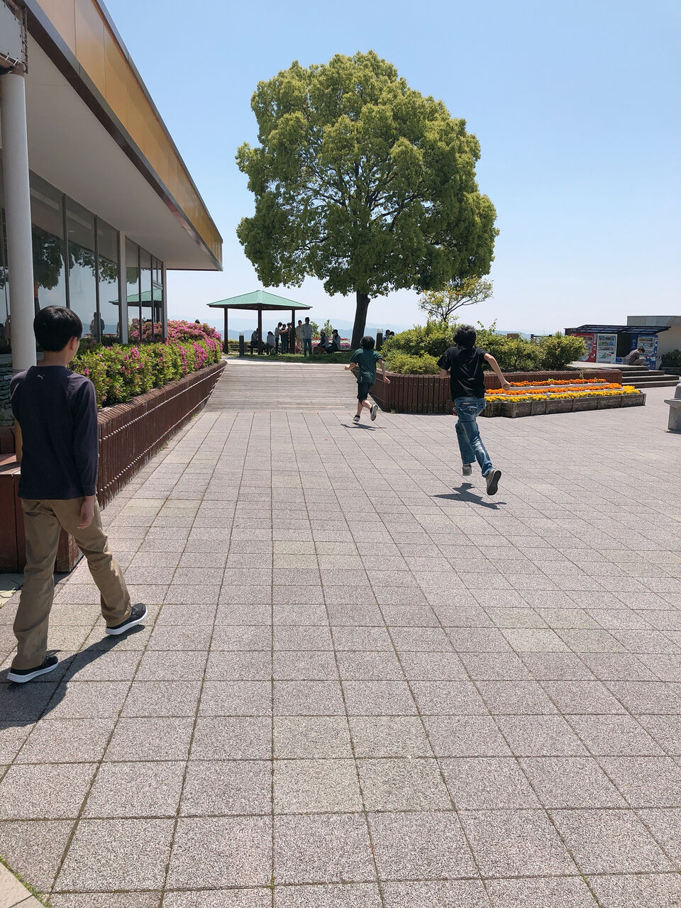 サービスエリアでご飯を食べ終わると、放牧されたかのように走り始める子供たち。
